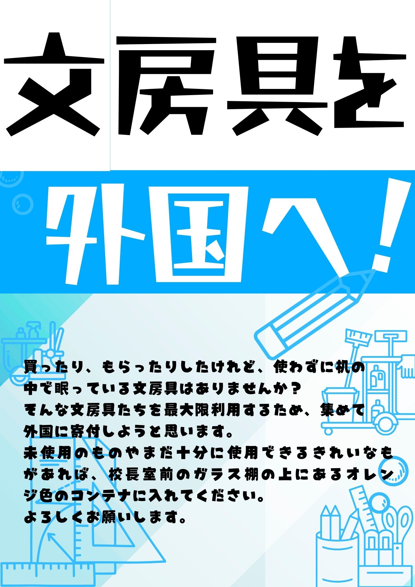 今年度、ボランティアリーダーの呼びかけで、家庭で不要になった文房具を回収し、外国に寄付することになりました。家庭や仕事場で。未使用またはまだ使用できるけれど不要な文房具がありましたら、ご提供ください。回収日はなく、自由に校長室前のコンテナに入れる方式ですので、どうぞよろしくお願いします。