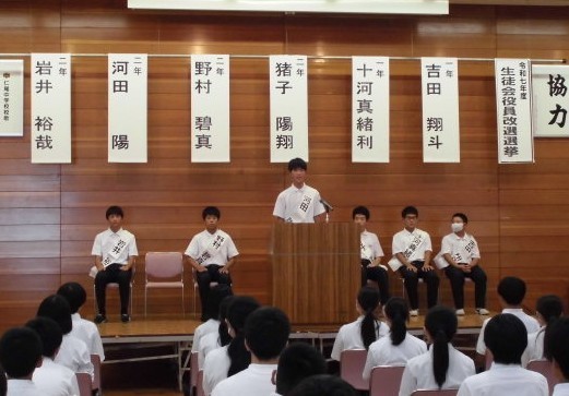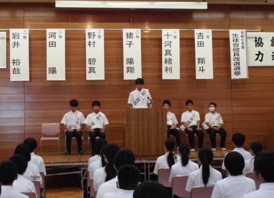 本日の5校時、生徒会役員改選を行いました。立候補した2年生4名、1年生2名が、これからの学校に対するそれぞれの熱い思いを、言葉と誠実な態度でアピールしました。前回同様に今回も定数と同数のため、信任投票になりました。結果は明朝、全校生に発表される予定です。