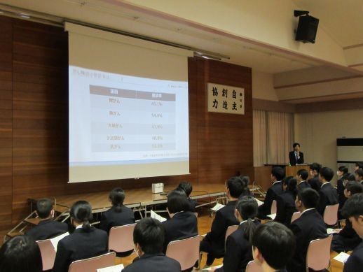 6校時にがん教育講演会を行いました。前半は、がん治療専門の看護師さんからがんについて教えてもらいました。まず、がんについて分かりやすく説明した動画を視聴しました。その後、「香川県は肺がんで亡くなる人が一番多いこと」「生活習慣ががんの理由として7割を占めること」「虫歯・歯周病ががんを増やすこと」「受診率の低さと喫煙ががんの最大の原因であること」「今は治るがんが増えていること」、最後に自分の責任は自分で取れる人になってほしいと教えていただきました。後半は、保険会社の方からがん検診について、「治療が進歩し、がんは治る病気になっていること」「がん検診率は約50%であること」と教えていただきました。終了後は教室に戻り、「大切なあなたへ」というメッセージカードを作成しました。どうぞ、今晩渡されると思いますので、ご覧ください。そして、本日子どもさんが学んだことを聴いてあげてください。よろしくお願いします。
