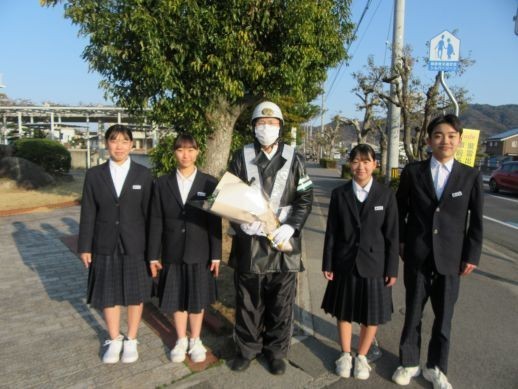 毎朝、学校北の交差点で交通指導をしてくれている指導員さんに、これまでの感謝の気持ちを込めてお礼をしました。暑い日も、寒い日も、雨の日も、仁尾中生の安全のためにご指導いただき、ありがとうございます。今後ともどうぞよろしくお願いいたします。