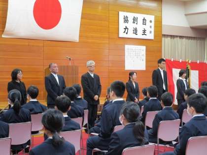 本日の午後、入学式がありました。元気いっぱいの新入生48名が入学してきました。在校生も参加して、久しぶりに全校生が揃った入学式を行うことができました。新入生の皆さんは早く中学校生活に慣れて、色々な面で自分らしさを発揮してください。保護者の皆さん、本日はあいにくの雨で、お足元の悪いなか、式にご出席いただきありがとうございました。本日より教職員一同、責任をもって子どもさんをお預かりさせていただきますので、今後とも、本校の教育活動にご理解・ご協力をいただきますよう、よろしくお願いいたします。