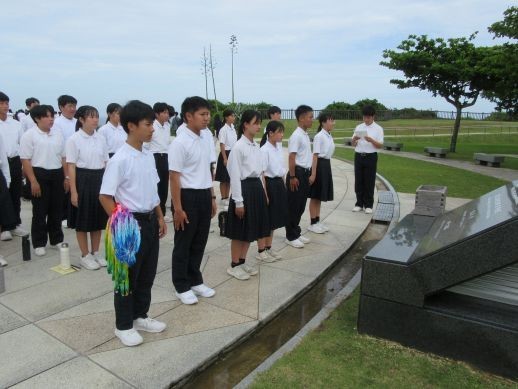 本日から3年生は修学旅行です。那覇空港に到着後、ひめゆり平和祈念資料館→平和祈念公園(平和集会含む)→糸数壕に行きました。本日は、80年前の戦争のつめ跡を巡るコースでした。平和について、しっかりと考える良い機会になりました。