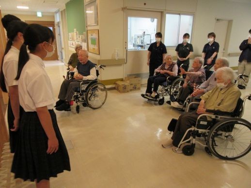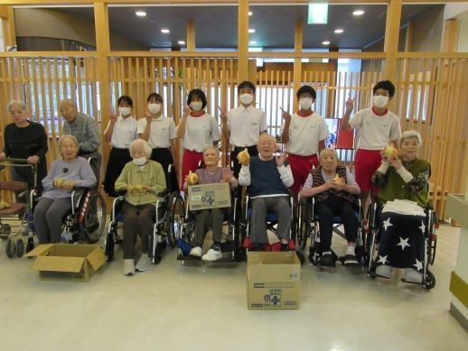 今年も、学校の畑で取れた野菜(タマネギ・ジャガイモ)をもって、生徒会役員がにお荘を訪問しました。タマネギの成長が物凄くて、お年寄りや施設の方に大変喜んでいただきました。
