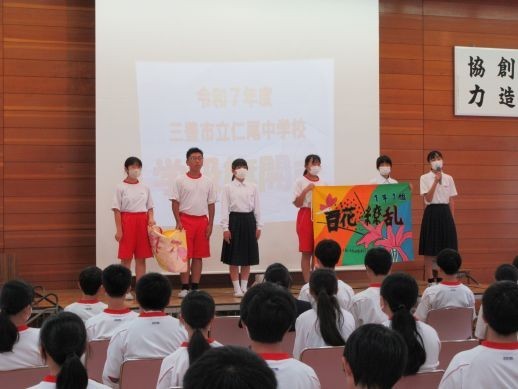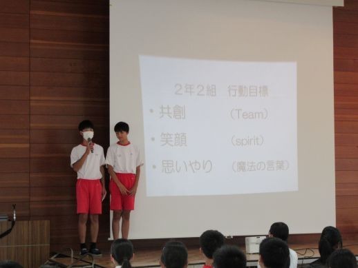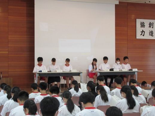 本日5校時に、学級紹介に旗のデザインに込めた思いや製作上の苦労話を加えての学級旗紹介、人権に関するクラス目標と具体的な行動目標を紹介する人権宣言がありました。その後、昨年度の行事と会計報告、今年度の行事計画と予算案、最後に生徒会からの提案について議事を行う生徒総会を行いました。全生徒が真剣に参加することができました。