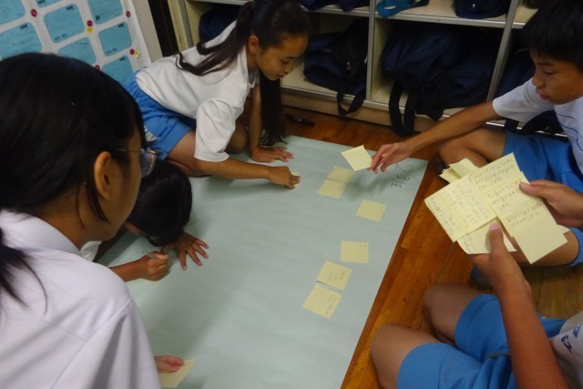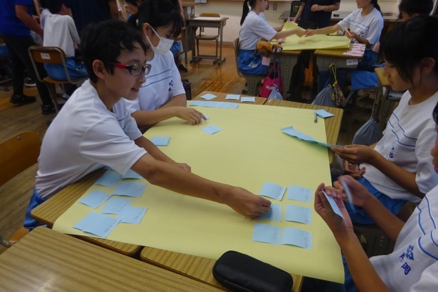 9月10日(水)5校時に1年生で、探究学習プログラムのスモールスタート1を実施しました。「日常のあるある」を考えました。各班ごとに模造紙に付箋をはりながら、書いたことを声に出して意見を共有しました。