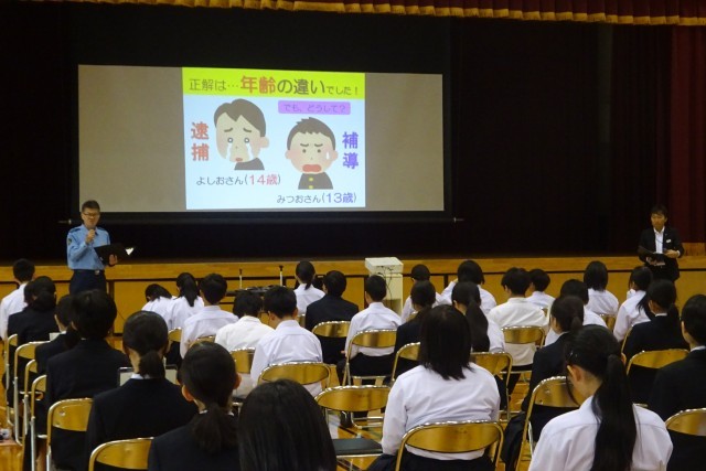 10月29日(水)、1年生を対象とした「13歳の自律教室」を開催しました。香川県警の方を講師にお招きし、まもなく迎える刑事責任年齢(14歳)を前に、中学生としてとるべき行動や、社会のルール、法律に対する自覚と責任について学びを深めました。この教室を通じて得た学びを、今後の学校生活、そして社会生活に活かし、生徒一人ひとりが自律した大人として成長してくれることを期待しています。