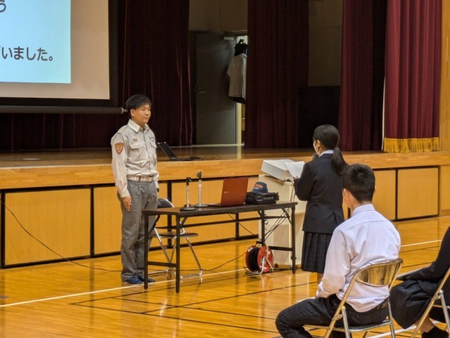 10月31日(金)、「いのちの先生事業」の一環として、三観広域北消防署より講師の方をお招きし、防災および救命処置に関する貴重なご指導をいただきました。今回の学習では、私たちにとって喫緊の課題である南海トラフ地震への備え、そして日常で起こりうる火災への対応策について、専門的な見地から具体的かつ実践的なお話を聞くことができました。地震発生時の身の守り方、火災を想定した避難経路の確認など、もしもの時に冷静に行動するための知識を深めました。今回の指導で学んだ「自助(自分自身で命を守る)」と「共助(周りの人と助け合う)」の精神を胸に刻み、地域の一員としての防災意識をさらに高めてまいります。