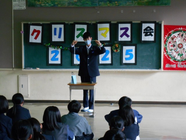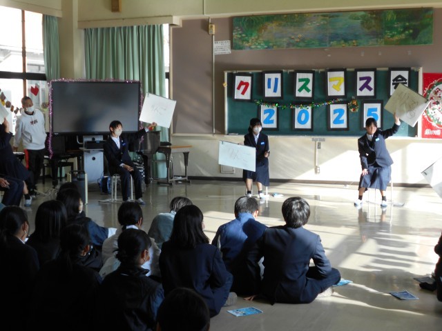 冬休みを目前に控え、1年生が企画満載のクリスマス会を実施しました。クラス対抗のゲームで絆を深めたあとは、有志によるステージ発表!ものまねやピアノ演奏など、友達の意外な特技に歓声が上がりました。サプライズの先生サンタによる演奏もあり、会場のボルテージは最高潮に。1年生らしい、元気いっぱいの冬の思い出ができました。
