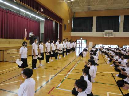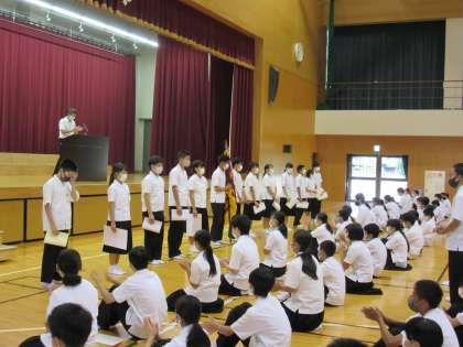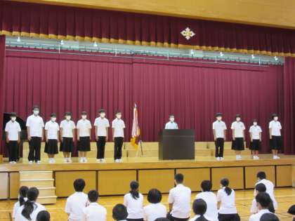 10月11日(月)、後期のスタートにあたり、全校朝礼で、生徒会役員引き継ぎ式、後期学級委員長の任命が行われました。今日から委員会活動や係活動も、一人一人が新しい役割を行っていきます。また、部活動を始め、多くの表彰も行われました。