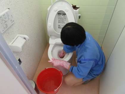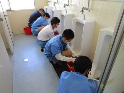 本日の午前中、香川掃除に学ぶ会とタイアップしてトイレ掃除を行いました。この会は、毎月1回県内の公共施設や小中学校のトイレを掃除している団体です。今回、初めて本校を会場に選んでいただき、生徒47名、教師9名が参加しました。便器を手で掃除することに最初は抵抗がありましたが、すぐ慣れて無言でひたすら磨き続けた結果、綺麗になった便器とともに、自分たちの心もしっかりと磨くことができたように思います。遠方をわざわざ来校していただき、丁寧な指導をしていただいた香川掃除に学ぶ会の皆さん、本当にありがとうございました。
