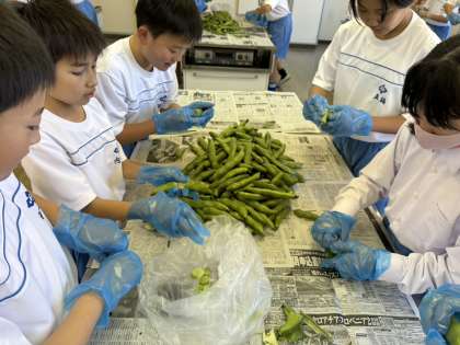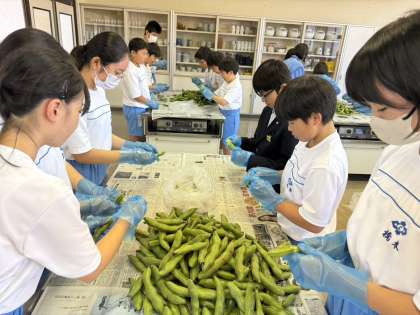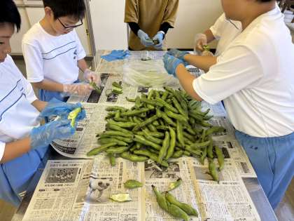 本日、毎年恒例の「そら豆のさやとりボランティア」を行い、1年生30名が参加しました。今年のそら豆は、仁尾町の方が大切に育ててくださったものです。このそら豆は明日の給食で「かき揚げ」にして、全校生でいただく予定です。楽しみですね。