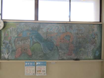 美術部員が共同制作で、2階廊下に黒板アートを完成させました。