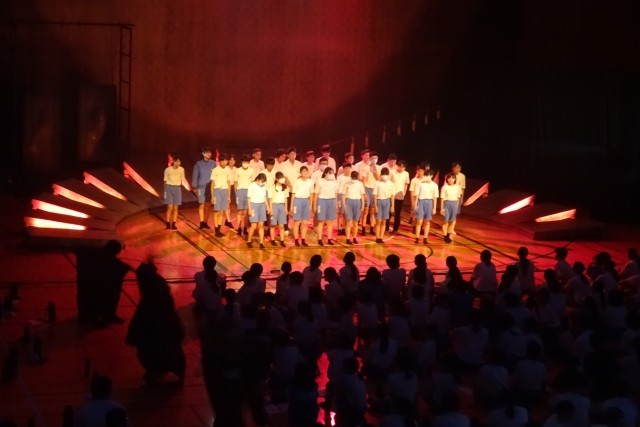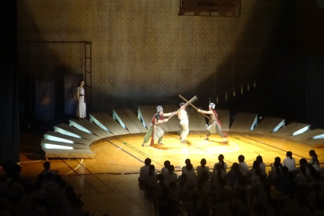 本日、東京演劇アンサンブルによる「走れメロス」の公演がありました。体育館のフロア全体で演じられ、間近で観劇することができました。劇中にはみんなで参加する場面もあり、楽しい一時を過ごすことができました。